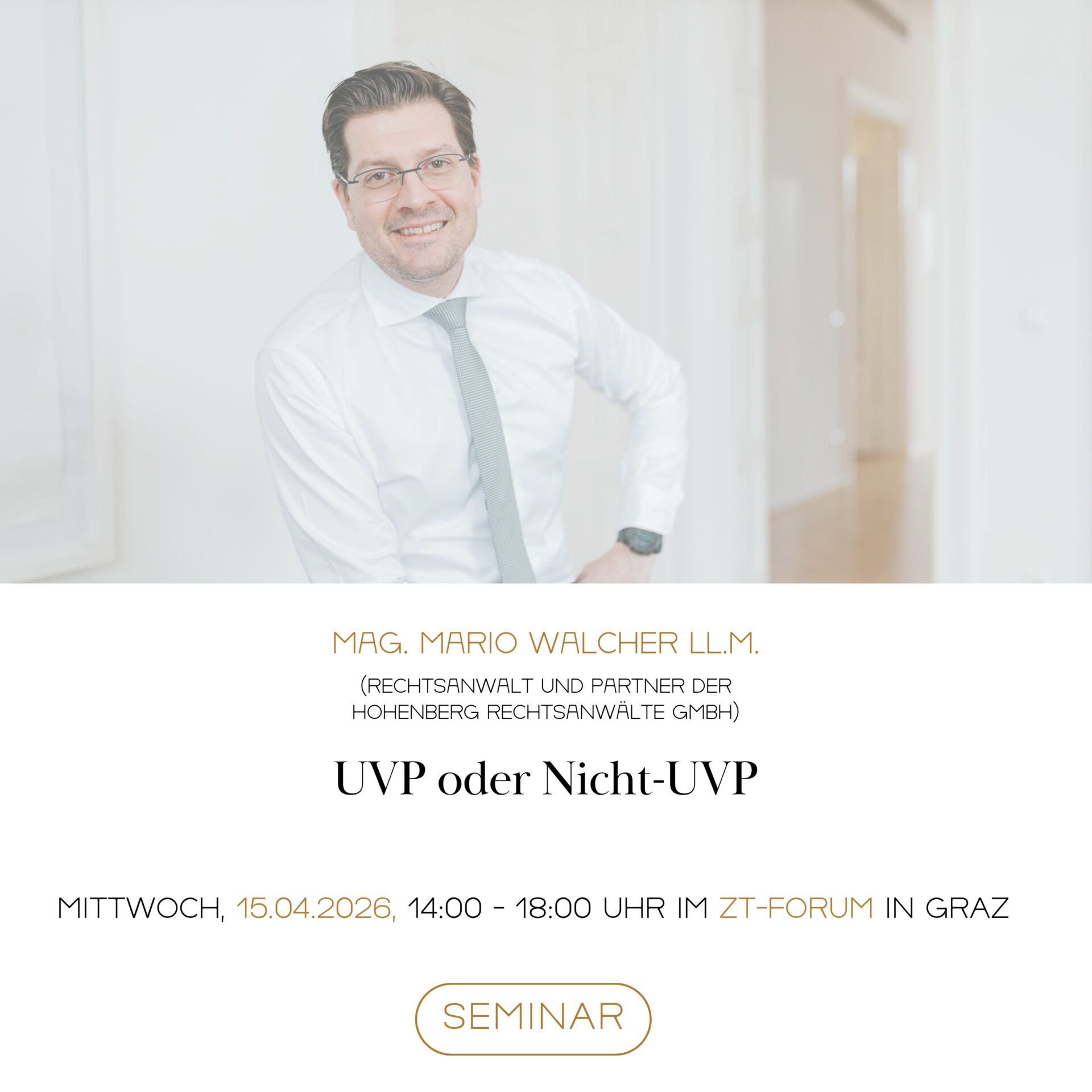 Am MI, 15.05.2026 von 14:00-18:00 Uhr ladet das ZIVILTECHNIKER-FORUM alle Ziviltechniker:innen, planenden Baumeister:innen und Ingenieurbüros, Mitarbeiter:innen der fachlich befassten Abteilungen des Landes Steiermark sowie Baubezirksleitungen, Repräsentant:innen von Gemeinden, Projektentwickler:innen und Bauträger:innen und alle sonstigen an der Thematik interessierten Zielgruppen sehr herzlich ein, dieses Seminar zu besuchen.